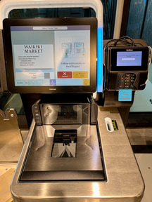 最後の会計はセルフレジが主流。ハワイでもパンデミック以降はセルフレジが急速に増えているが、とまどっているとすぐにサポートに来てくれるので心配ない。