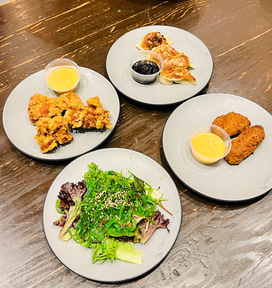 日本酒など酒類も豊富で、居酒屋メニューは、枝豆、餃子、唐揚げ、たこ焼き、串カツ、フライドポテト、サラダなどが並ぶ。