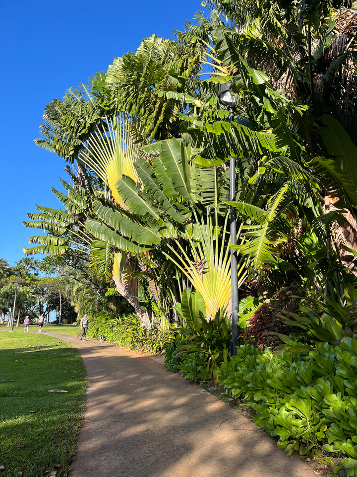 では、ワイキキ周辺の散歩で見られるハワイ固有種の植物や伝統植物はというと、白いハイビスカス、ナウパカ、ティーリーフ、ミロの木、パンの木、ハラの木、パラパライなど。ちなみにどの公園にもある、そら豆のお化けのような豆がなる大きな木は外来種。ものすごく強い繁殖力を発揮している。