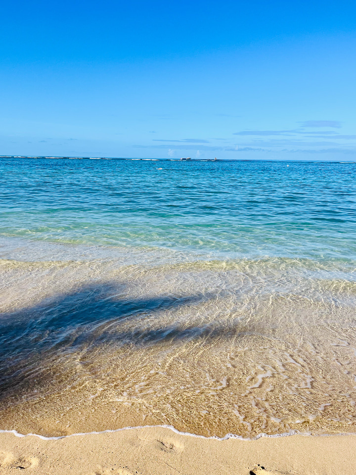 波打ち際の散歩は、朝の特権。9時過ぎくらいからホテルのビーチパラソルがポツポツと設置され始め、日中から夕方にかけてはパラソルがぶつかりそうになるほど並び、砂浜を散歩するのは至難の業。にぎやかになる前に波の音を聞きながら裸足でビーチを歩いて、静かなワイキキの顔に触れてみよう。