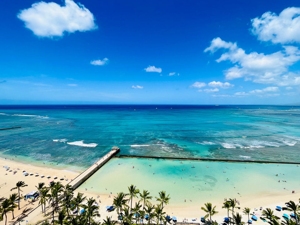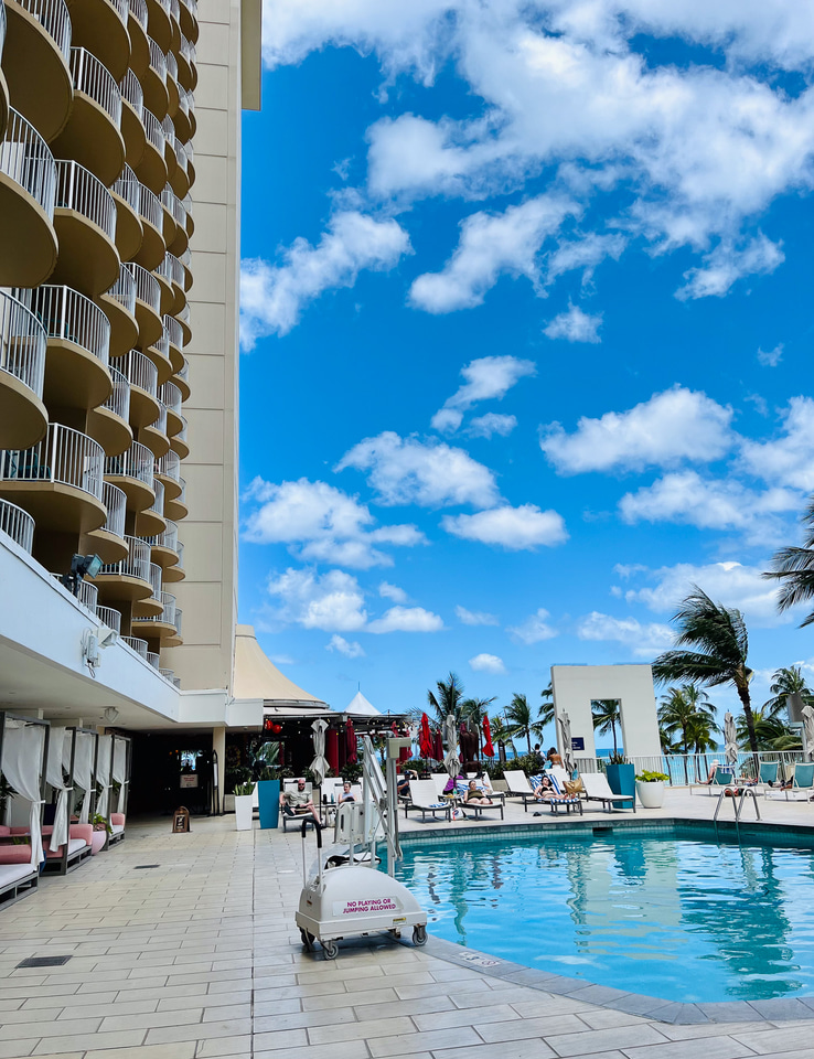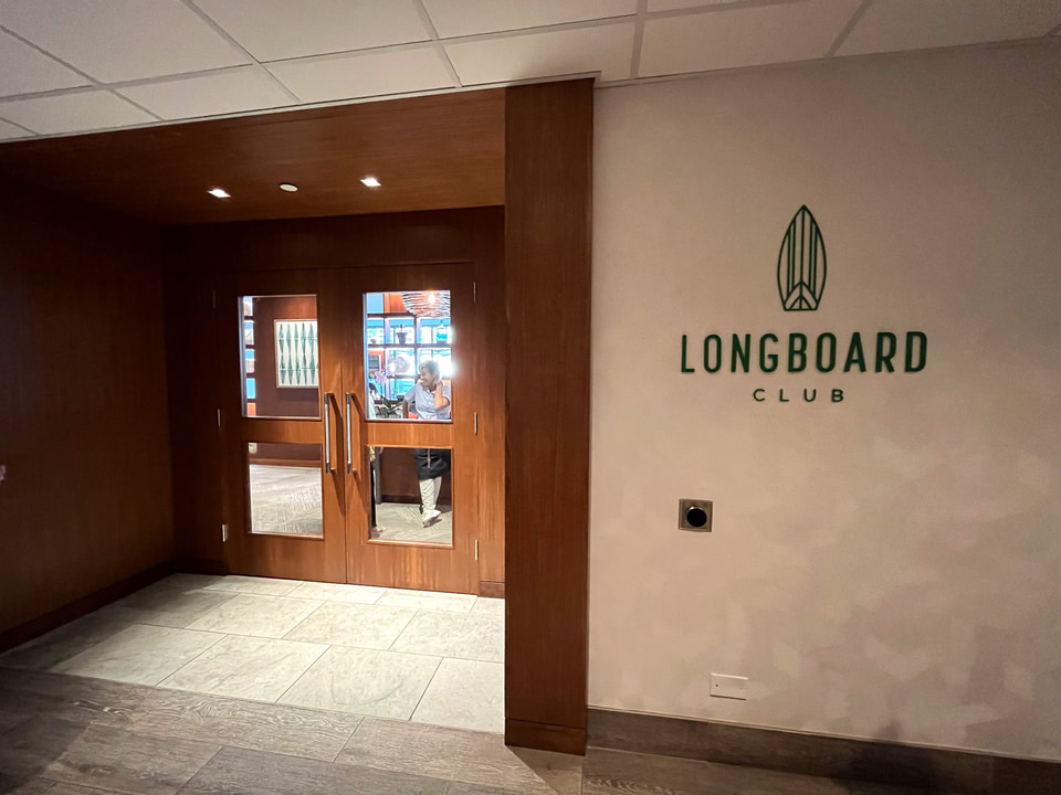 カラカウア通りにあってクヒオビーチが目の前の建つホテル「アロヒラニ・リゾート・ワイキキビーチ」。かつてのパシフィックビーチホテルで、数年前に大改装した。その後オープンしたのが、宿泊者の一部が利用できるクラブ「ロングボード・クラブ」。追加料金によりここへアクセスできるようになるので、ここはあまり混み合うことがない穴場となっている。