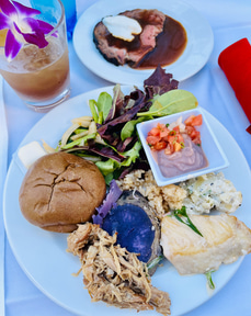 食事は、ビュッフェ形式。ハワイの食材を使ったロミロミサーモンやカルアポーク、フリフリチキン、ポイなどハワイの伝統の食事に舌鼓を打てる。