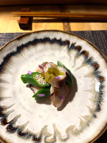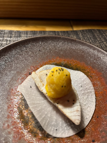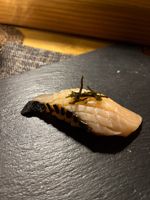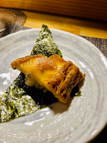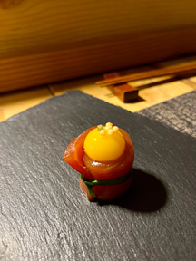 そして、カムエラトマトとマウイオニオンを乗せ、ロミサーモンをイメージしたキングサーモンにぎりに続いて、対馬産アナゴ手巻きは、あえて軽く仕上げた特製ダレとフィンガーライムでさっぱりと。刻みワサビとポン酢ジュレを乗せた北海道ホタテは、ほんのり炙って甘みを閉じ込めている。