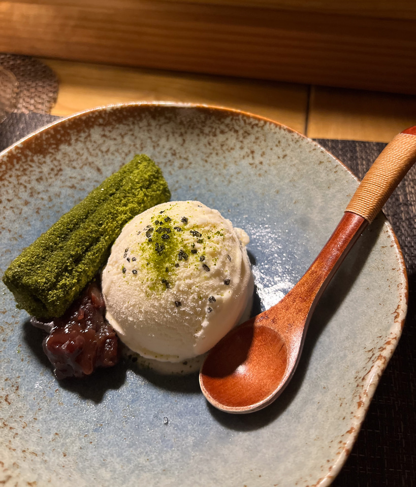 デザートは、揚げたての抹茶チュロス、餡、ハワイで作るロゼラニのアイスクリームを添えた、3つの文化のコラボレーションを堪能するスイーツ。