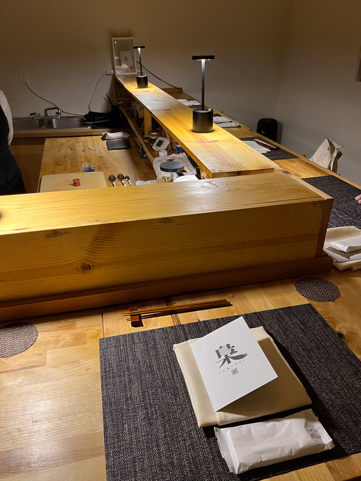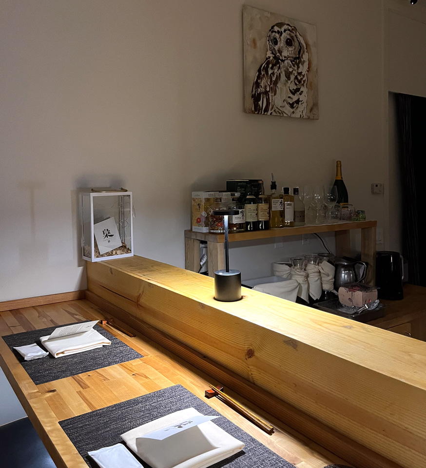 「BUHO」の入口を入ったらひたすらまっすぐ進み、さらに細い通路を突き当たりまで達っしたら、右を見てみよう。そっと暖簾が掲げられていることに気付く。ここをくぐると「Sushi Fukurou -梟-」だ。分かりづらいのはもともとは倉庫として使われていたから。改装して「超隠れ家」としてオープンしたのが2022年。