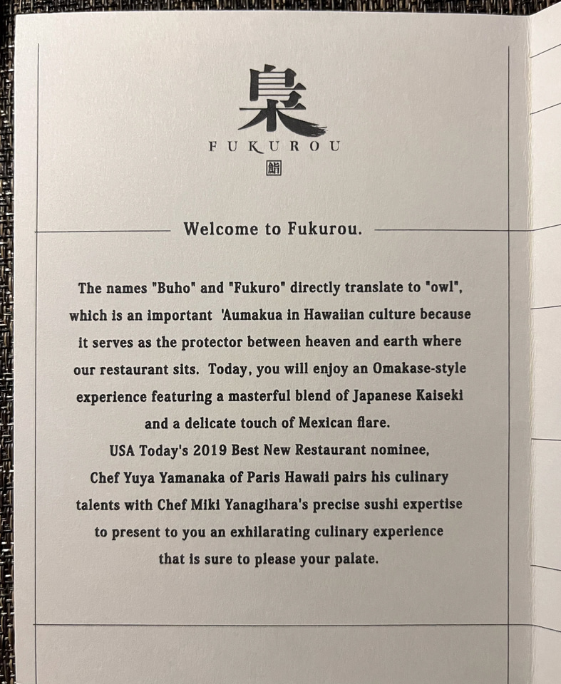 店内はカウンターの10席のみで、完全予約の2部制になっている。メニューは12品90ドル。一般的な「寿司屋」ではなく、コンセプトは「和×ハワイ×メキシコ」。日本、ハワイ、メキシコの食文化を巧みにミックスさせた料理がおまかせコースとしてサーブされる。ちなみに、この店が入るメキシカンレストラン「BUHO」はスペイン語でフクロウを意味するのだそう。