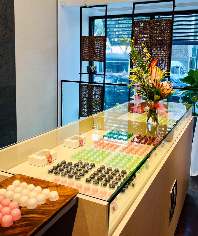 ボンボンショコラという、丸みを帯びた艶やかなチョコレートが、店内のショーケースに並べられ、宝石のように輝いている。徹底してハワイ産にこだわり、オアフ島産のカカオ豆のほか、ハワイ島産のハチミツ、モロカイ島産のシーソルトなどを使用して、一つ一つ丁寧に手作業で作られている。