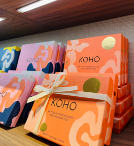 マカダミアナッツチョコレートの老舗ブランド「ハワイアンホースト」グループが立ち上げた高級チョコレートブランド「KOHO」。アウトリガーホテル・ワイキキビーチ1階に2023年1月に店舗を移転オープンさせた。