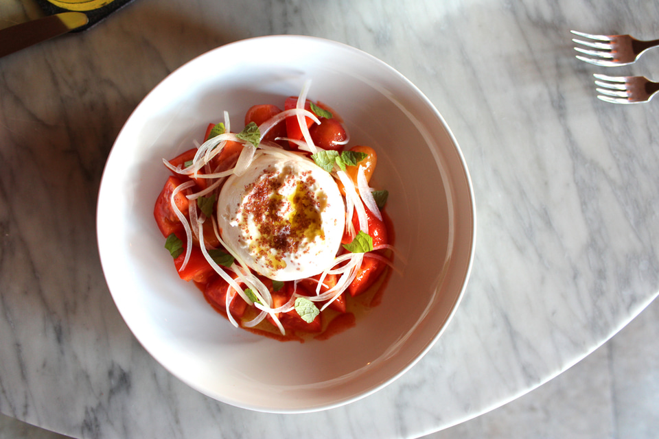 ここまでの3品とカクテルで満足感を得られるが、この店を訪れるなら一度は食べてほしいのが、トマトとブッラータのサラダ。29ドルではあるけれど数人で分けられる。甘いトマトにフレッシュなブッラータがトロンとのっていて、スライスした玉ねぎとミントがアクセントに。キモとなっているのがハワイならではの「リヒンムイ」。乾燥梅を甘塩っぱく味付けしたパウダーで、ハワイの人は子供から大人までこの味付けが大好き。これがトマトにあまりにもマッチしていて、このメニューにハマる人が続出している。