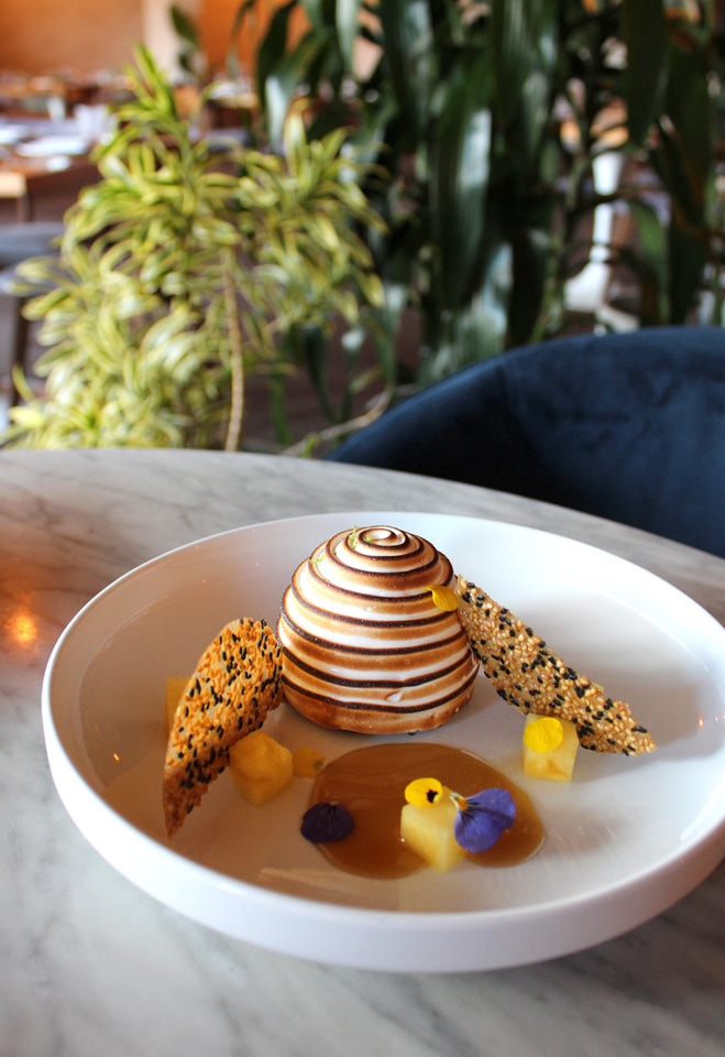 最後にオーダー必須は、シェフのパートナーでパティシエのアマンダさんが作るデザート。アイスクリームをケーキ生地で包んでメレンゲで覆うデザート「ベイクドアラスカ」をイメージして「ベイクドハワイ」を作ったという。焼き色をつけたメレンゲのなかにはマンゴーとココナツシャーベットが閉じ込められていた。食べるのがもったいなくてしばらく見つめてからナイフを入れたが、その後あっという間に完食した。