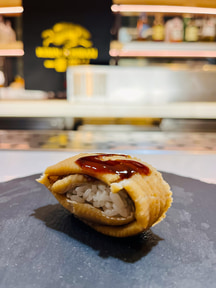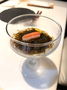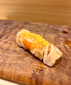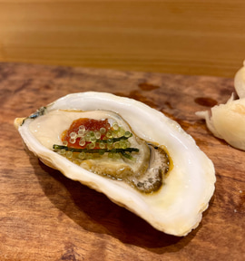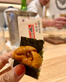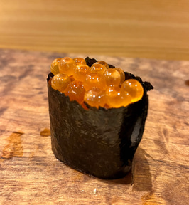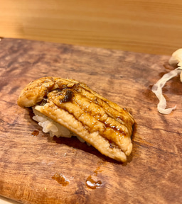 山形県のはえぬき米を使用した赤シャリに新鮮なネタを乗せ、しょうゆをひと塗りした握りが一貫ずつ続く。敷かれたのりの上にご飯とウニ、イクラが乗った一品、もずくなど、飽きることのないおまかせコースを堪能できる。シャリに穴子をぐるっと巻いて目と舌を楽しませ、お腹がはち切れそうになる16品のボリュームを楽しもう。