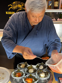 大将の大亀さんは、ニューヨークなど米本土を経て、1993年からハワイで寿司を握ってきた熟練寿司職人。今年2月、ワイキキにポップアップとして出店したのがこの店。場所はインターナショナルマーケットプレイス1階にあるクヒオアベニューフードホール内。カウンター8席のみのこの店がユニークなのは、日中はカフェとなっていて、木曜から土曜の夜(週3日)だけは寿司店になること。