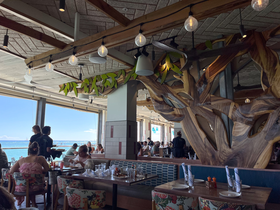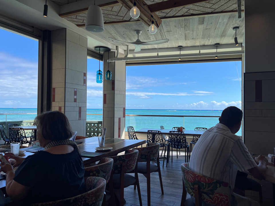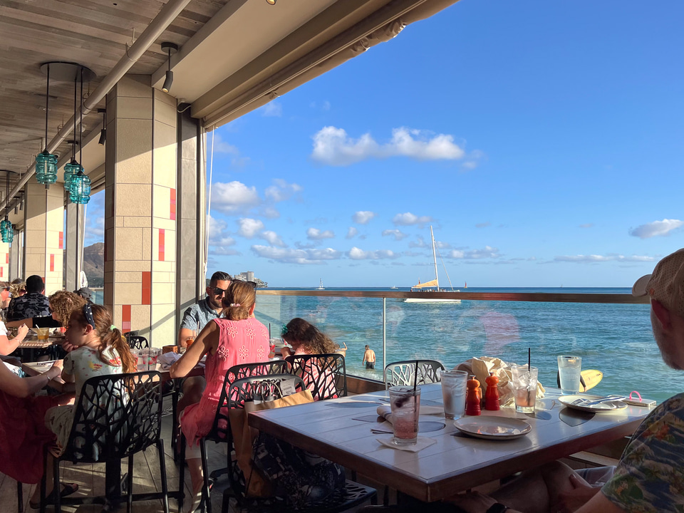ワイキキの西端、アウトリガー・リーフ・ワイキキ・ビーチ・リゾートホテルの1階にあるのだが、そのロケーションが大胆過ぎる。オーシャンフロントというよりオン・ザ・ビーチで、波の音どころか、波しぶきが店に入ってくるほど「海の上」感覚で食事を楽しめるのだ。