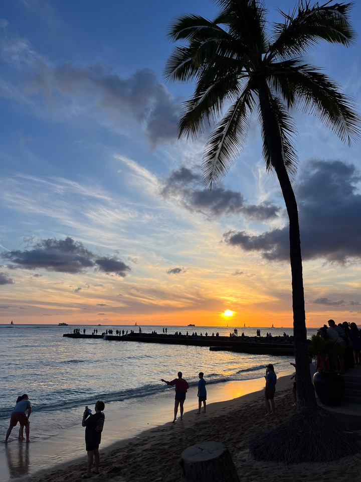 波の音を聞きながら風が舞う店で食事を堪能したあと、窓際からこんな景色を望められる。店のなかではライブ演奏による軽快な音楽も奏でられている。五感でハワイの魅力に触れられるハッピーアワーは、まさに「幸せな時間」だ。