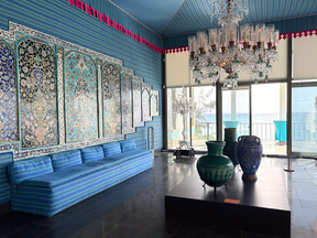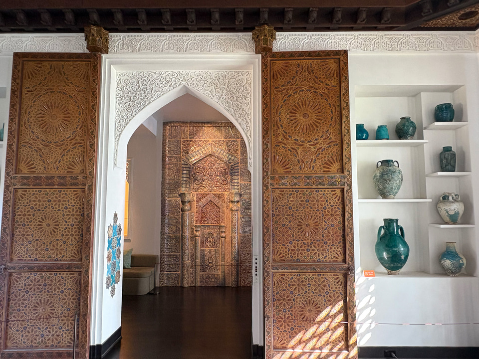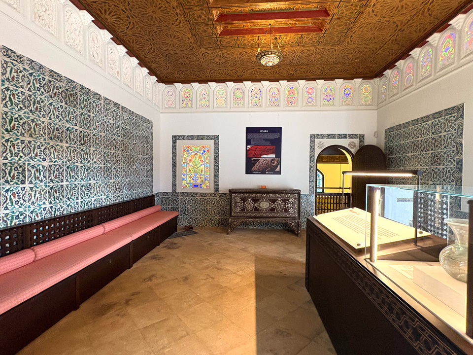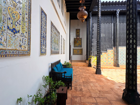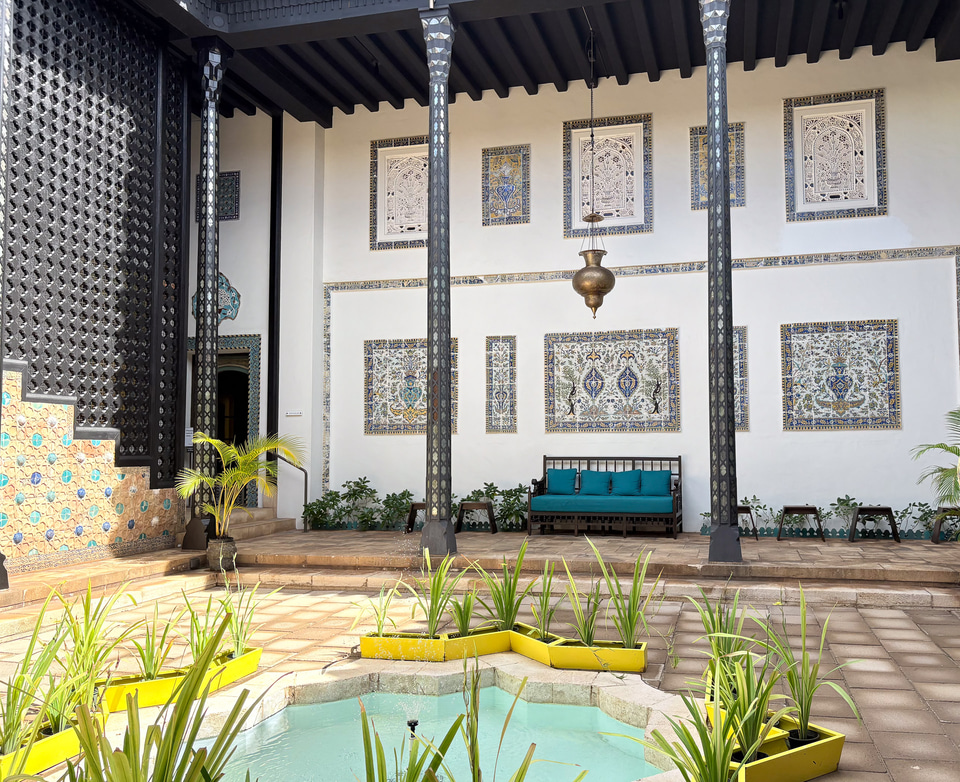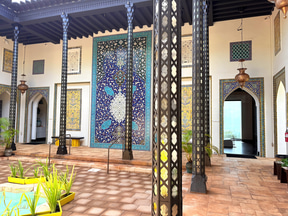 リビングルームやダイニングルームなど、部屋ごとにテーマを持ち色彩豊かなイスラムの意匠に満ちている。ムガール様式のアーチ、大理石細工の装飾窓“ジャリ”、ペルシャのモザイクタイル、そしてダマスカスから移築された木彫りの天井や壁装飾など。イスラム各地の素材や技法を集めた工芸品も各所に置かれ、どこを切り取ってもイスラムの豊かな文化に触れられる。