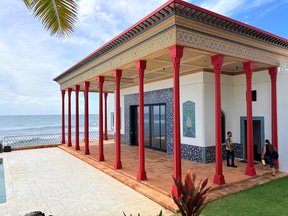 邸宅全体が美術館でありながら、一歩外に出れば庭園とプール、青い芝とヤシの木々、そして目の前に広がるのは太平洋。青空と太陽の光に照らされた白亜の建物とのコントラストはハワイならではの景観。ここが理想郷であることを体感できるだろう。「ダイヤモンドヘッドから吹くやさしい風に包まれるこの土地にはマナが宿る」と日本人のドーセント(解説員)が教えてくれた。