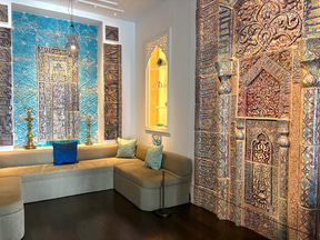ドアを開けると隅々までイスラムの装飾美で囲まれたエントランスの空間が広がる。釘を使わずにはめ込まれた天井装飾はモロッコに特注したもので、幾何学文様が繊細に描かれている。壁面のタイルは、17世紀のトルコの伝統美、イズニックタイル。