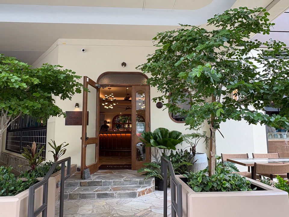 緑で覆われたエントランスを入った瞬間に、ワイキキの喧騒を忘れる空気に包まれた。ステンドグラスアートを囲むバーラウンジ、木目のアーチの向こうのダイニングエリアからは流木のシャンデリアやドライフラワーが目に飛び込んできた。インテリアやテーブルに木を使うなど、店名のとおり「Botanico=ボタニカル」な世界観が広がっている。