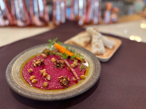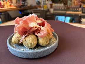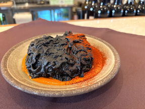 ビーツ&カリフリフラワーの自家製フムスをピンサにのせて一口。ほどよくしっとり、ビーツ特有の土っぽさとカリフラワーの優しさが見事に調和した旨みに変わっていた。ナポリ名物の海苔のゼッポリーニにプロシュートが山盛りに乗った一品、「ハワイ島の溶岩に見立てた真っ黒のローカルジャンボマッシュルーム イタリアンソーセージ詰め 真っ黒フリット ピリ辛アラビアータソース」(長~い料理名)など、プレゼンテーションも印象的だった。