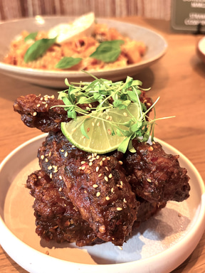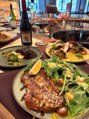 ディナーは、USDAプライムステーキやシーフードタワー、シグネチャーのスティッキーコリアンリブやスパイシーカラブリアンパスタなど、世界各地のエッセンスが効いた一皿が人気。どれもボリュームがあった。