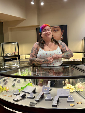 次に立ち寄ったのは、坂を下って右手にあるジュエリーショップ「ホノルル・ピアシング・カンパニー」。インパクトと愛敬のある店主が迎えてくれた。繊細で多様なデザインのピアスがショーケースに並び、価格帯は「65ドルから6000ドルまであるわよ!」とのこと。ピアスホールの施術も行なっている。