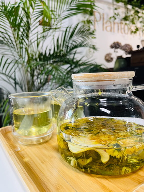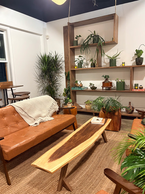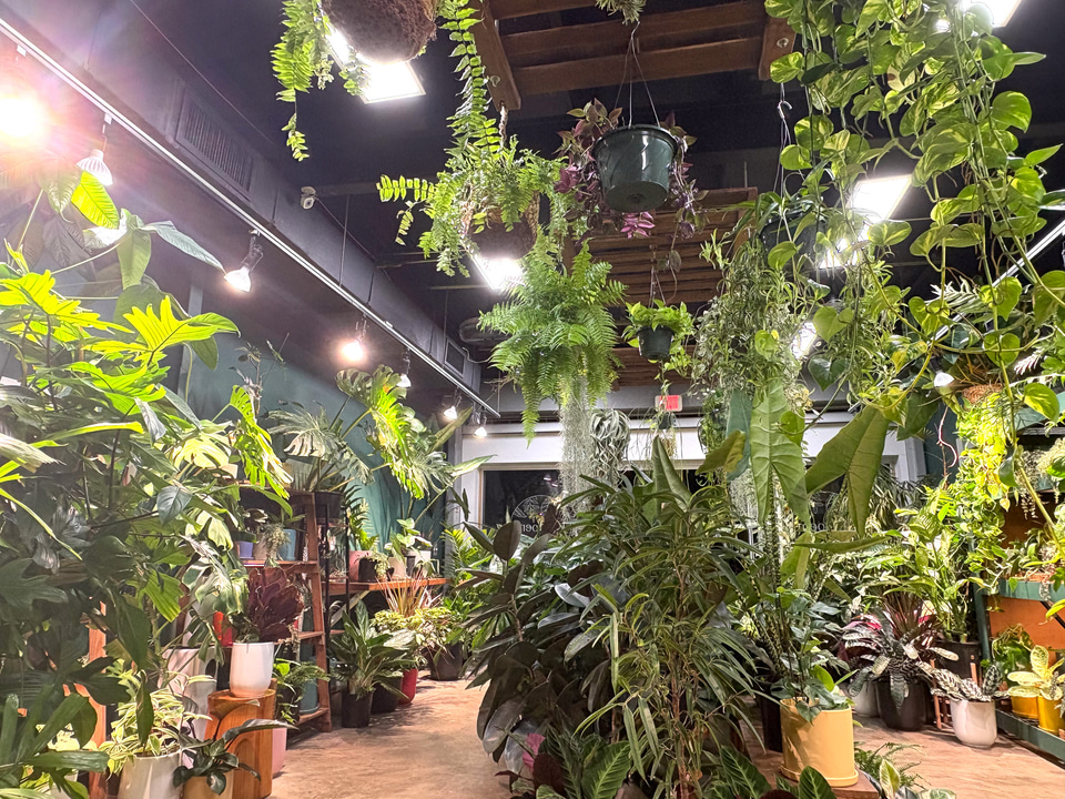 一歩入ると、まずジャングルがお出迎え。これらの植物の販売、ワークショップなども行なう植物と寄り添う店で、その奥に進むとカフェが出現する。