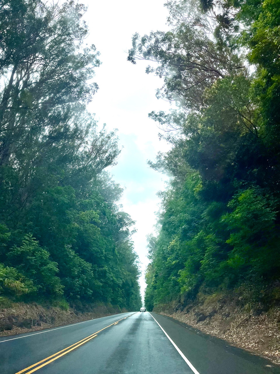 ハワイ島北東部の小さな街「ホノカア」へ続く道。広大な牧場のなかにある街ワイメアからホノカアへ向かう途中、五感でマイナスイオンを感じる。