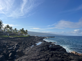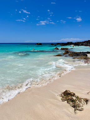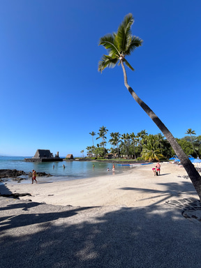 黒砂やグリーンサンドビーチで知られるハワイ島だけれど、個人的ナンバーワンは、海の透明度が際立つ白砂のビーチ。溶岩の黒と砂浜の白のコントラストはハワイ島ならでは。カイルア・コナからクルマで30分弱のクアベイは地元の人の憩いのビーチ。