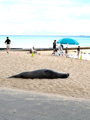 7月某日。朝のビーチを歩くと、ハワイアン・モンクシールが仰向けで気持ちよさそうに「朝寝」をしていた。3月から8月にかけて彼らは出産シーズンとされ、親子で見かけることもある。