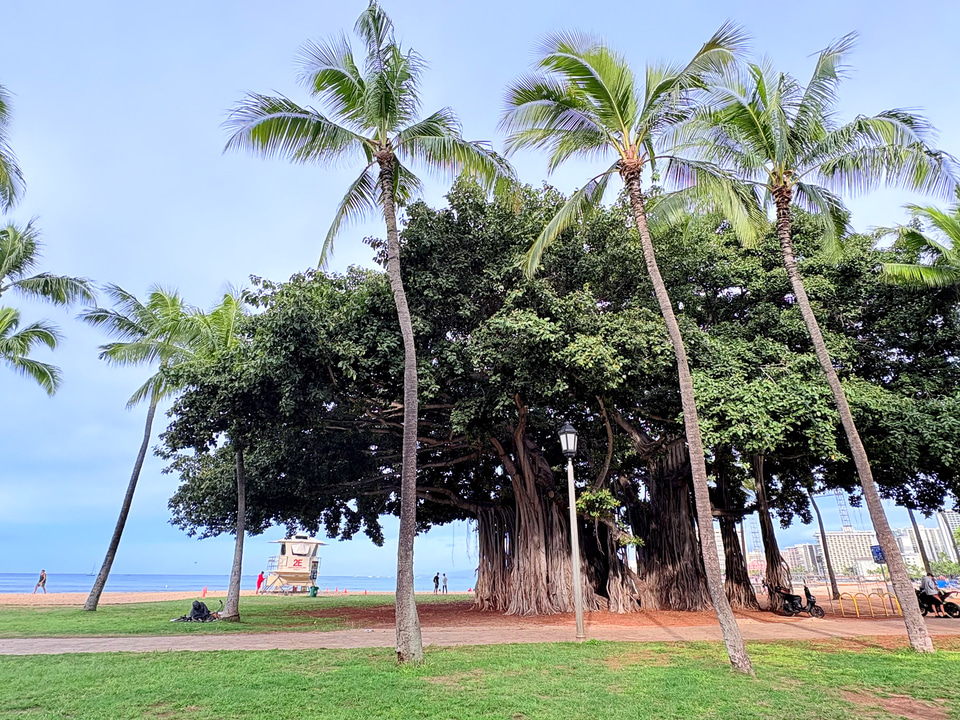 いつも通るカラカウア通りのバニアンツリー。樹齢何年だろう? あまりにも自然にそこにある存在だけれど、たまにふと立ち止まって見上げてしまうことがある。縦横に広がる枝と地面に垂れる気根。奇跡のような木。