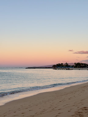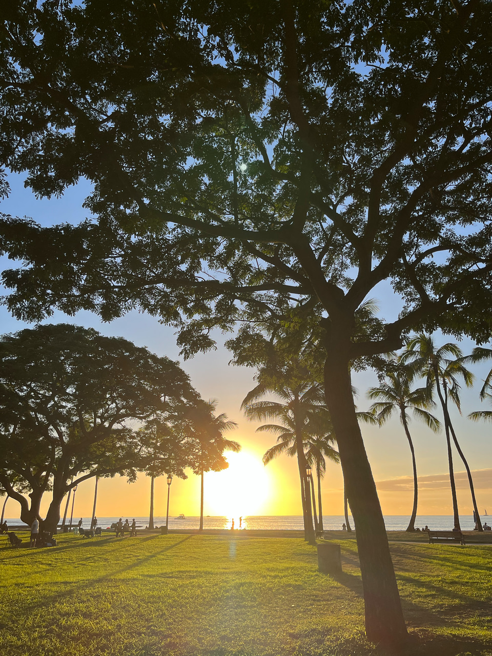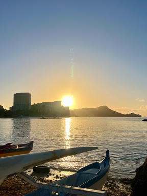 ワイキキでは、秋から冬にかけての期間のみ、太陽が海に沈む光景を見ることができる。