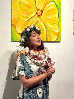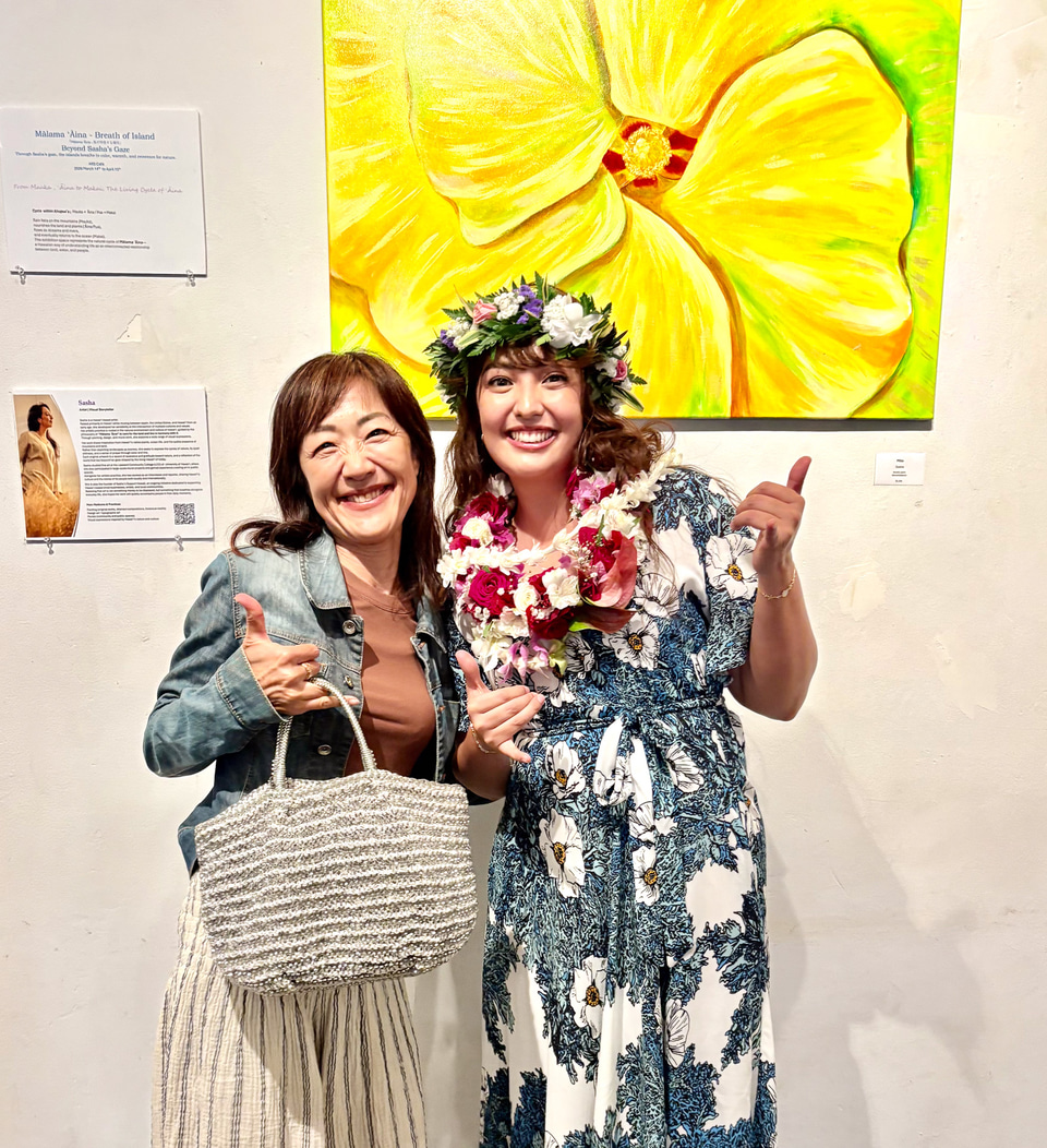 この週末にお披露目パーティに伺ったところ、彼女の友人や仕事仲間らが集まり、会場は明るく温かな祝福の空気に包まれていた。個展のテーマは「マラマ・アイナ(大地を想う心)」。ノースショアの自然のなかで育ったサーシャさんら子供たちの間で日常的に口にしていた言葉だという。