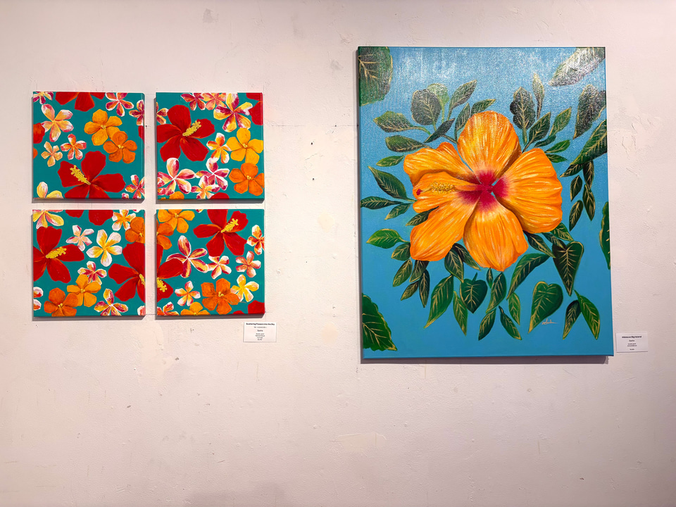 「自然を汚すことは、私たち人間の生活そのものを脅かすことだと、子供でも感覚的に理解していました。今回の作品は、そんな私の視点で、ハワイの大地が持つ生命の息吹、自然の静かな力強さ、そして山(マウカ)と海(マカイ)をつなぐ循環をテーマに描きました」とサーシャさん。ハワイ古来の自然との共存を表現し、絵を通してそれを伝えたいという思いで展示している。多忙な日々の合間を縫い、今回の展示作品のほとんどを描き上げた。