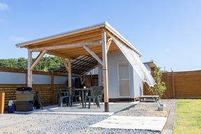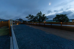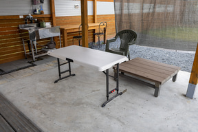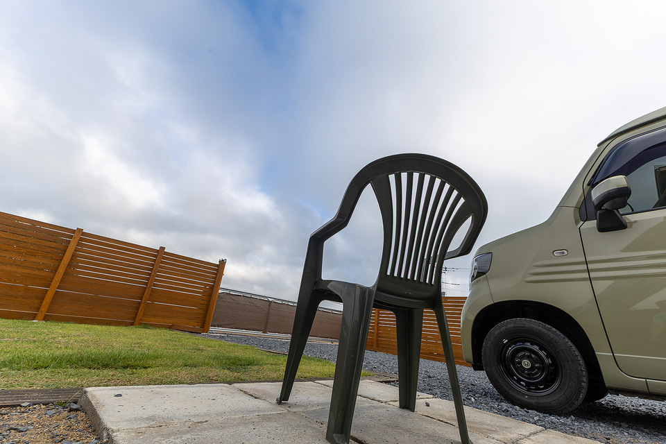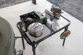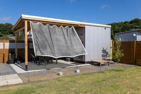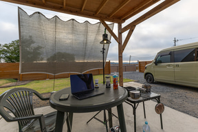 サイト正面(ゲート側)は西向きになるので午後には西日が来るが、日よけがあるのとそもそも気温が東京ほど高くないし、風も心地いいので快適に過ごせた。アウトドアでテーブル展開は開放的でいいものだが、「屋根がある」開放的な場所は安心感があってなおいい。特に気温が下がって涼しさを感じた夜の居心地がよかったので、今回は寝る直前まで屋根下スペースで過ごしていた。