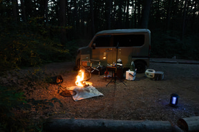 取材日は夏休みが終わったあとの平日だったので、ほかの利用客がいない状況で一晩を過ごすことができた。フレックスフィールド内は炊事棟以外に照明がないし、月の出ている夜でも森のなかゆえに月明かりはサイトまで届きにくく、夜はしっかりと暗くなる。秋の肌寒さと合わせて、なかなかいい雰囲気を味わえるはずだ。