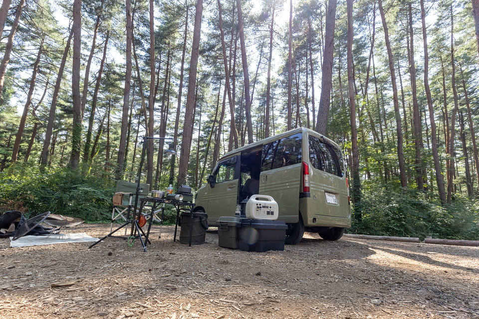 また、整地されているとはいえ、自然の地形を利用しているので地面には多少の傾斜があって、サイト内に展開する装備のレイアウトによっては、クルマを停める位置が傾斜部分になってしまうこともある。そのため、傾きが気になる場合はタイヤの下に敷くスペーサー(板など)を用意していった方がいいかもしれない。この辺りが一般的なRVパークとは違う部分と感じた。
