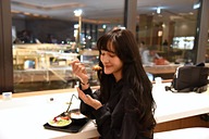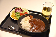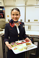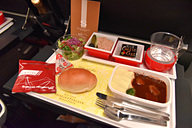 ここで味わっておきたいのが名物「JAL特製オリジナルビーフカレー」。台湾に続きカウアイ島への旅に同行してくれたモデルのFukiさんも「美味しい!」と声に出してしまうほど。駐機場を窓から眺めることができ、これから始まる旅を盛り上げてくれます。