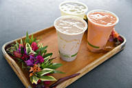 この日は「FRUITY TARO SMOOTHIES」(各6.50ドル、約709円)のなかから、タロをベースにココナッツやバナナ、クロロ、ほんのりハチミツで柔らかな甘さの「KULOLO LISCIOUS」と、タロベースにパパイヤやバナナ、グァバジュースのハーモニーがうれしい「POLYNESIAN PAPAYA」をオーダー。ポイ好きのFukiさんは一口目から「美味しい!」といつのまにか飲みきるほど。
