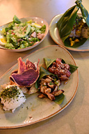 オーダーしたのは、「SAM CHOY'S SIGNATURE POKE」から「Duo Poke Tasting」(21ドル、約2289円、1ドル=約109円換算)、「NORTH SHORE GREENS」からはカウアイ島産のトマトを使った「Koloa Landing Cobb」(15ドル、約1635円)、「SOUTH SHORE PLATES」より「Mahi Lau Lau」(27ドル、約2943円)。