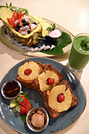 なお、朝食やルームサービスでも「HOLOHOLO GRILL」は大活躍。地元産フルーツがたっぷりな「Locally Grown Fresh Fruit Plate」(11ドル、約1199円)と「Pineapple upsidedown french toast」(13ドル、約1417円)。ドリンクに「Green Flash」(8ドル、約872円)を注文。
