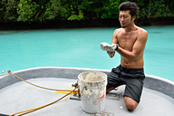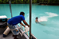 ポイントに船が到着すると、朝早いこともありラッキーな貸し切り状態。まずはアンディさんが海に入り、海底から砂を掻き上げ、えいっ!と手放すと海が一気に真っ白になりました。