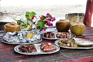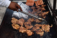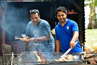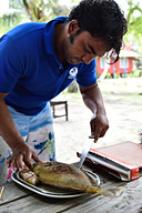 カープ島に上陸すると、オリール船長がBBQコックさんに変身! かたまり肉、大きな魚、ビーチにあるバーベキューグリルで手際よく作業が進み、美味しそうな香りが漂います。