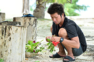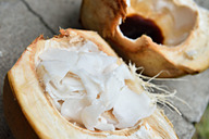 「これ、食べてみて~」とSHIMAさんが持ってきてくださったのは「ヤシの身のお刺身」。(海の)イカの味がするからと言われ食べてみると……!! 不思議なことに、確かにイカのお刺身のような感じで美味しい!