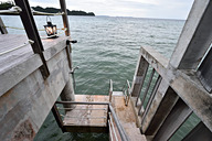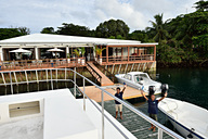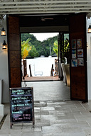 なのですが、ここでどうやってクルーズ??と思ったら、お店の奥になにやら階段が。そう、店舗の奥に専用の桟橋があり、そこにディナークルーズ船が停泊していました。