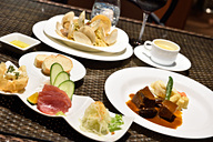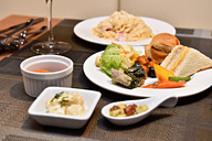 サンセットクルーズを終え、桟橋に戻ります。せっかくの機会なので、マリーナ カフェ ヴィータでもディナーをいただきました(船でもレストランでも、スタッフみんなで少しずつ取り分けていただいています)。