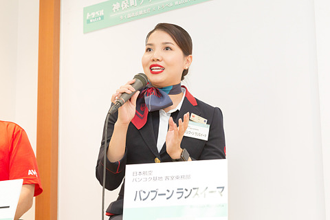 さらに同じくスペシャルゲストとして、JAL(日本航空)バンコク基地所属のCA(客室乗務員)バンブーン・ランスイーマ氏も登場。ニックネームではファーさん(FAH=空の意味)と呼ばれているそうで、まさに空の仕事に就くべくして就いたと会場が盛り上がった。ファーさんのイサーン地方での思い出としては幼少期に訪れたチャイヤプームが印象的だったとのこと。国立公園で眺めたドーク・グラチャオの美しい花の姿に心が奪われたそうだ。また、イサーン・シルクもレコメンドしてくれた。柄もエリアにより異なるため、お気に入りを探してほしいとのことだった。