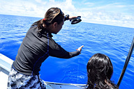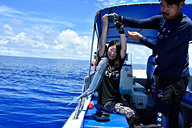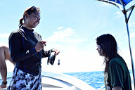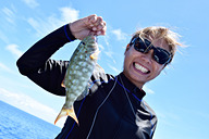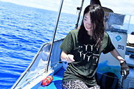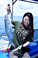 なかなか釣れないと言っていたMayukiさんからもほどなくという悲鳴(歓声?)が。一人では引き上げられず、逆に海に身体が引っ張られます。