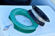 船長のバイレーさんがポイントに船を停めると、全員に「手釣り」の仕掛けが配られます。プラスチックリングに巻かれた船釣り用のナイロン糸に、重りと糸を結びつけただけのシンプル過ぎる仕掛け。そこにイカの切り身などエサを付けて海に投げ入れるという、これまたシンプルな釣法です。リールではなくリングと手先で糸をスルスルと出し、海底に着いた感触があったら数回糸を引っ張ります。