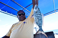 「これは大物だぞ!」とガイドのドミニクさんがヘルプに入り、今日一番の大物を釣り上げることができました。ここまでわずか30分ほど。パラオの海、すごいです。
