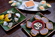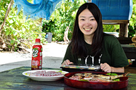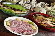 ここでちょっと休憩。先ほど手釣りした魚たちをスタッフがテキパキと料理して、炭火焼きに、お造りに、豪華なランチが完成しました。もし天候に恵まれず魚が釣れない場合でも弁当や肉が用意されているのですが、やはり自分たちで釣った新鮮なお魚を食べる喜びは格別ですね。